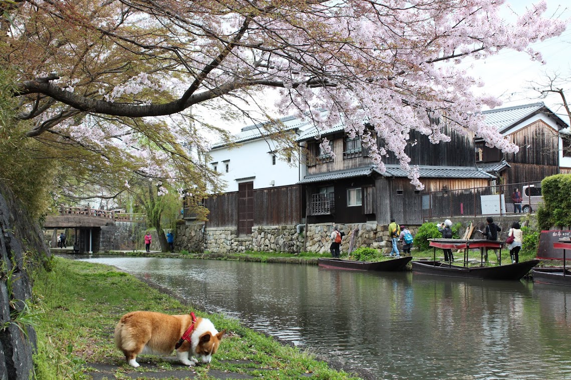 當時騎單車沿著湖岸東側北上的途中,經過了一處很美的古老小鎮「近江八幡」,令我驚艷不已,但因為騎車需要注意時間的掌控,不能多加停留,始終是我心中的一個遺憾,因此去年春天帶著巧比一起到日本旅行時,特地安排再度造訪這座城鎮,恰好在春季櫻花最美的時節重遊,沿著古意盎然的街道漫步,景色美不勝收,浪漫無邊,如果打算在春天造訪關西,相當推薦到這個地方走走。
